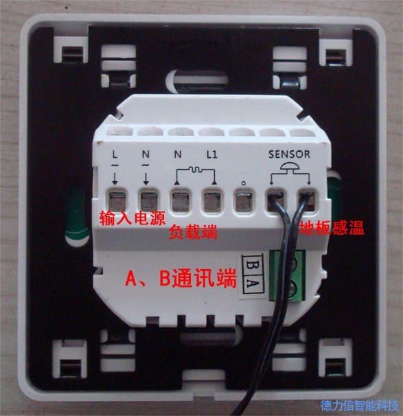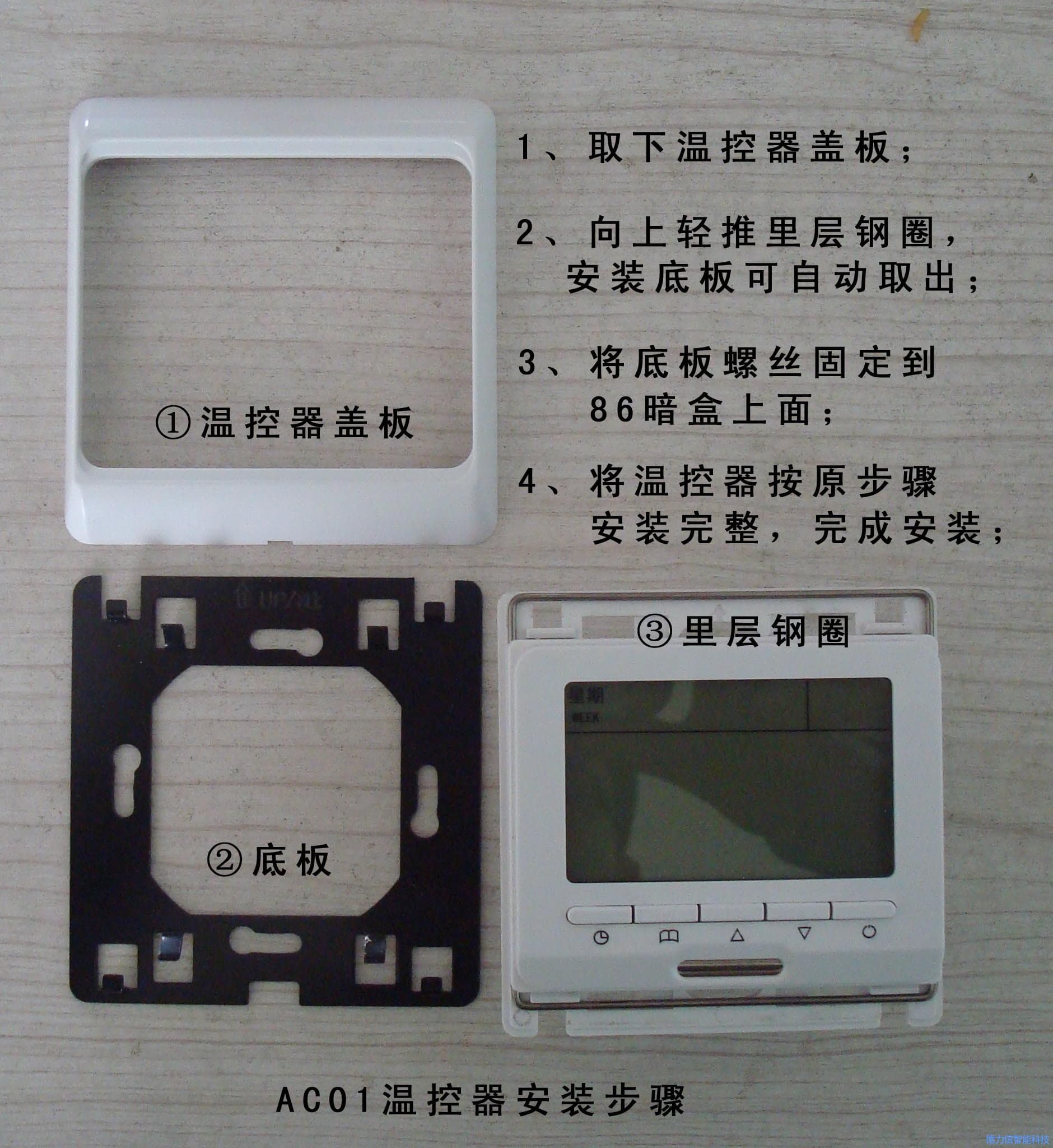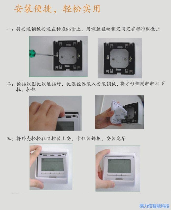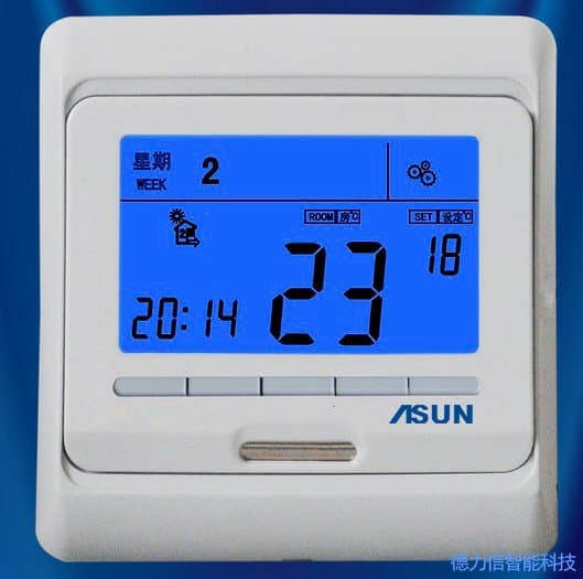 产品适用:电地暖、电热膜、电辐射器的温度控制。 功能应用:集成的应用功能,可满足大部分使用需求。 时段功能:根据部分地区地暖委员会时段标准定制。 -------------------------------------------------------------------- 总述 · 周编程采暖温控器采用*新的单片机控制技术,具有极高可靠性及强大的抗干扰性 · 适用于电采暖的电热设备与水系统采暖的电动执行器、电热阀门的控制或壁挂炉控制 · 每天可以设置8个时段编程,每周7天,每周56个时段独立编程 · 可以选择手动控制或自动时段控制 · 键盘锁功能,防止小孩误操作 · 断电时钟继续运行,不影响时段设定值 · 阻燃材质,安全可靠,时尚外观,镜面易清洁 · 外置限温传感器,线长2.5米(选配) · 网络通讯功能,通讯距离达1000米(选配) 技术参数 ·电源输入:220VAC±15%, 50/60 Hz ·*大切换功率为16A 3600W ·内置传感器设定范围:5 - 35°C ·内置传感器测量范围:0 - 35°C (可更改) ·外置传感器测量范围:0 - 90°C (出厂设定:65°C) ·自耗功率: <1.2W ·内置传感器:热敏电阻 ·设定步进: 1 °C ·外置传感器:长度2.5米 ·控温精度:±1 °C ·产品净重量:178 克 外形尺寸:86 x 86 x 13 mm 产品图片 ![]() ![]() ![]() 安装图示 ![]()